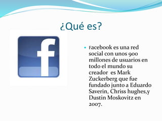 Facebook es una red social fundada en 2004 por Mark Zuckerberg y otros compañeros de Harvard. Actualmente tiene 900 millones de usuarios a nivel mundial. Aunque ofrece beneficios de comunicación, también plantea riesgos como el ciberacoso, la difusión de mensajes de odio, y fraudes donde los usuarios comparten sus credenciales.