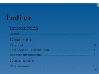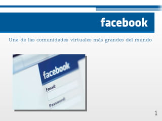 Facebook comenzó en 2004 como una red social creada por Mark Zuckerberg para estudiantes universitarios. Actualmente tiene más de 500 millones de usuarios a nivel mundial y se ha convertido en una de las comunidades virtuales más grandes del mundo. El impacto de Facebook ha sido transformar la forma en que las personas usan Internet y conectarse a través de redes basadas en su situación académica, lugar de trabajo o región geográfica.