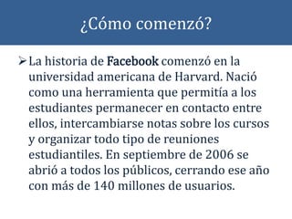 Facebook comenzó en Harvard como una herramienta para que los estudiantes se mantuvieran en contacto y organizasen eventos. Ahora es una de las redes sociales más populares del mundo con millones de usuarios conectados. Los usuarios crean un perfil, añaden amigos, comparten fotos y actualizaciones, y se comunican a través de mensajes y videollamadas.