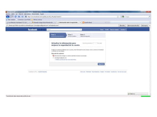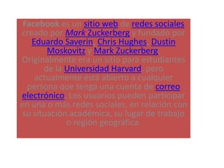 Facebook es un sitio de redes sociales creado por Mark Zuckerberg para estudiantes de Harvard que ahora está abierto a cualquier persona con una cuenta de correo. Los usuarios pueden conectarse en redes relacionadas con su escuela, trabajo o región. Para unirse, los usuarios deben proveer información personal y verificar su cuenta a través de correo electrónico. Una vez dentro, los usuarios deben configurar la privacidad de su cuenta para controlar quién puede ver sus publicaciones y fotos.