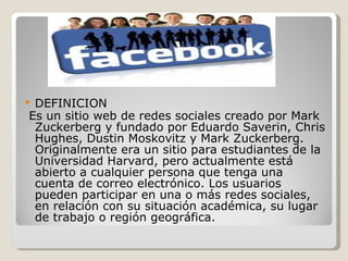 El documento define Facebook como un sitio de redes sociales creado por Mark Zuckerberg para estudiantes de Harvard que ahora está abierto a cualquier persona con una cuenta de correo. Permite localizar amigos perdidos y agregar nuevos, compartir fotos y mensajes. Tiene más de 500 millones de usuarios globales y recibe críticas por sus efectos en menores y privacidad.