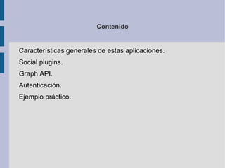 Este documento describe las características generales de las aplicaciones de Facebook, incluyendo plugins sociales, la API de gráficos y autenticación. Explica cómo las aplicaciones pueden integrarse con perfiles de usuario, feeds de noticias y más. También proporciona un ejemplo breve de la aplicación Badoo.