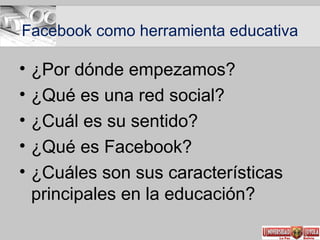 Facebook puede ser una herramienta educativa útil. Ofrece funcionalidades como perfiles, grupos y páginas que permiten la comunicación y colaboración entre estudiantes y profesores. Al usar Facebook, los profesores pueden acercarse más a los estudiantes y generar conocimiento de forma colaborativa. Trabajar en esta red social mejora la comunicación en el aula y permite explorar nuevos métodos de enseñanza y aprendizaje.