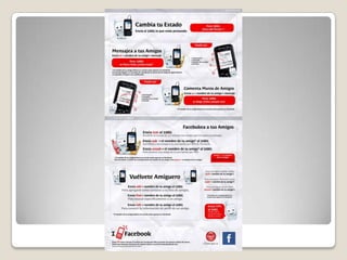 El documento describe los pasos para configurar Facebook en Claro desde un teléfono móvil: 1) Ingresar a la cuenta de Facebook, 2) Hacer clic en "Configuración de la cuenta" y luego "Móvil", 3) Configurar el país y número telefónico para recibir un código de autorización por mensaje de texto, el cual se debe ingresar para completar la configuración. Existen otras formas de actualizar Facebook desde un teléfono móvil como aplicaciones especiales o la conectividad inalámbrica.