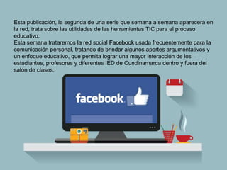 Este documento describe las utilidades de Facebook para procesos educativos. Explica que Facebook puede usarse para comunicar e interactuar con la comunidad educativa sobre temas prioritarios de la institución. También brinda herramientas para difundir información, motivar a los actores educativos y formarlos en competencias ciudadanas y aprendizaje.