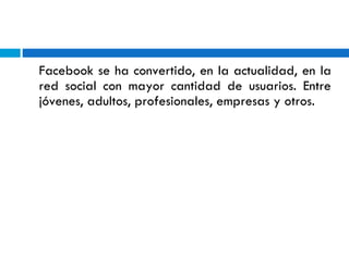 Facebook ofrece tres tipos de cuentas: perfiles personales para mantener contacto con amigos y familia, páginas visibles para todos para promover negocios o marcas, y grupos administrados por un usuario para compartir intereses específicos. Las páginas en Facebook brindan beneficios como enlaces a sitios web, visibilidad en buscadores, cantidad ilimitada de seguidores, y métricas de análisis a través de Insights. Los plugins sociales también ayudan a integrar contenido de sitios web en Facebook para generar más exposición