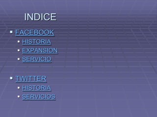 El documento proporciona información sobre las redes sociales Facebook y Twitter. Resume que Facebook fue creada por Mark Zuckerberg para estudiantes universitarios y ahora permite a cualquier persona crear un perfil, mientras que Twitter fue lanzado en 2006 como un servicio de microblogging que permite enviar mensajes de hasta 140 caracteres llamados tweets.