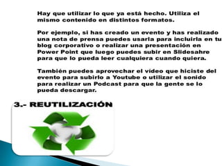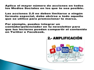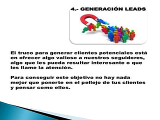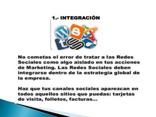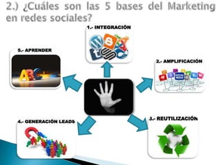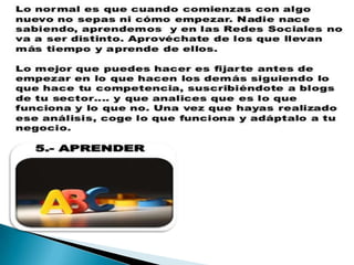 El documento compara Facebook y Twitter, señalando que Facebook puede ser más efectivo para grandes empresas mientras que Twitter ofrece más apoyo para PYMES debido a su enfoque en la colaboración. Aunque ambas redes son recomendables, el documento aconseja comenzar con Twitter y expandirse lentamente a otras herramientas. Luego proporciona instrucciones detalladas sobre cómo configurar una página de Facebook para una empresa y aprovechar aplicaciones y anuncios.