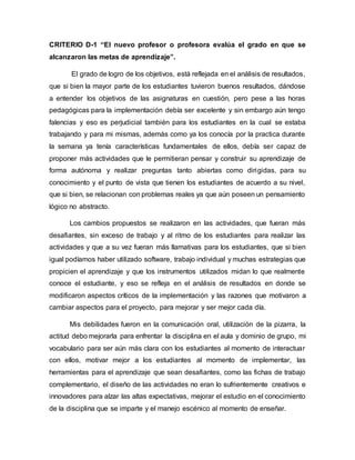 El documento aborda la autoevaluación de un profesor sobre su eficacia en la enseñanza, destacando la importancia de adaptar actividades para mejorar el aprendizaje de los estudiantes. Se señalan tanto debilidades, como en la comunicación y el diseño de actividades, como fortalezas en la kinésica y el monitoreo constante. Asimismo, se enfatiza la necesidad de reflexionar y motivar a los estudiantes para alcanzar metas, enfatizando la equidad y la confianza en el aula.