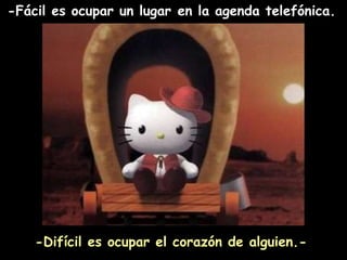 El documento contrasta las cosas fáciles y difíciles en la vida. Señala que es fácil juzgar a otros o exhibir la victoria, pero más difícil reconocer los propios errores o asumir la derrota con dignidad. También indica que es fácil decir que amamos o pensar en mejorar, pero más difícil demostrar el amor todos los días o realmente mejorar uno mismo a través de la acción.
