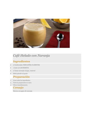 El documento presenta varias recetas de comida, incluyendo albóndigas, café helado con naranja, postre de galleta, arroz con leche y coco, pollo con jamón y piña, flan rápido de manzana, rollitos de acelga, ensalada tipo caprese, galletas de queso, salpicón de carne, pechugas adobadas, pollo a la mostaza, mousse poblano con elote y pechuga de pollo en ensalada de parmesano. Cada receta incluye una lista