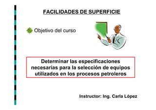 Este documento presenta la información sobre un curso de Facilidades de Superficie que cubre temas relacionados con el flujo de fluidos en la industria petrolera. El curso analiza conceptos como cálculo de caída de presión, selección de tuberías, bombeo de líquidos, compresión de gas, intercambiadores de calor y variables relevantes como flujo, presión, temperatura y propiedades de los fluidos. El curso es impartido por la Ing. Carla López y consta de 3 parciales escritos para
