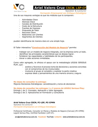 El documento describe la Metodología Canvas, una herramienta para diseñar modelos de negocio. Consta de 9 módulos que explican cómo una empresa genera ingresos e interacciona para ser rentable. Incluye actividades clave, alianzas, canales de distribución y más. El modelo permite clarificar la estrategia y tomar acciones. También se menciona el apoyo con la metodología LEGO Serious Play para facilitar la toma de decisiones.