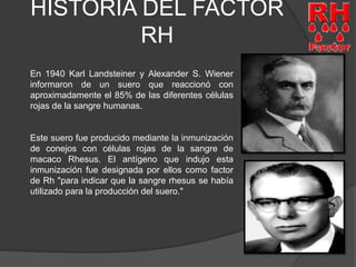 Este documento resume la historia, importancia clínica, nomenclatura y estructura del factor Rh. Explica que el factor Rh fue descubierto en 1940 y clasifica a las personas como Rh positivo o negativo dependiendo de si tienen o no el factor en su sangre. También describe la importancia del factor Rh en transfusiones de sangre, trasplantes y embarazos, así como los diferentes modelos que se han propuesto a lo largo de los años para describir su estructura genética.