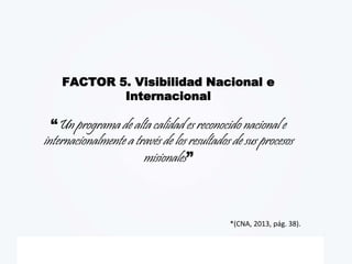 Este documento describe los esfuerzos de un programa para lograr visibilidad nacional e internacional. El programa tiene una política para revisar periódicamente el plan de estudios a la luz de referentes externos. Más del 60% de las asignaturas incluyen contenido internacional y el 56% de los docentes usan casos internacionales. El programa también promueve la movilidad académica y la cooperación a través de convenios nacionales e internacionales.