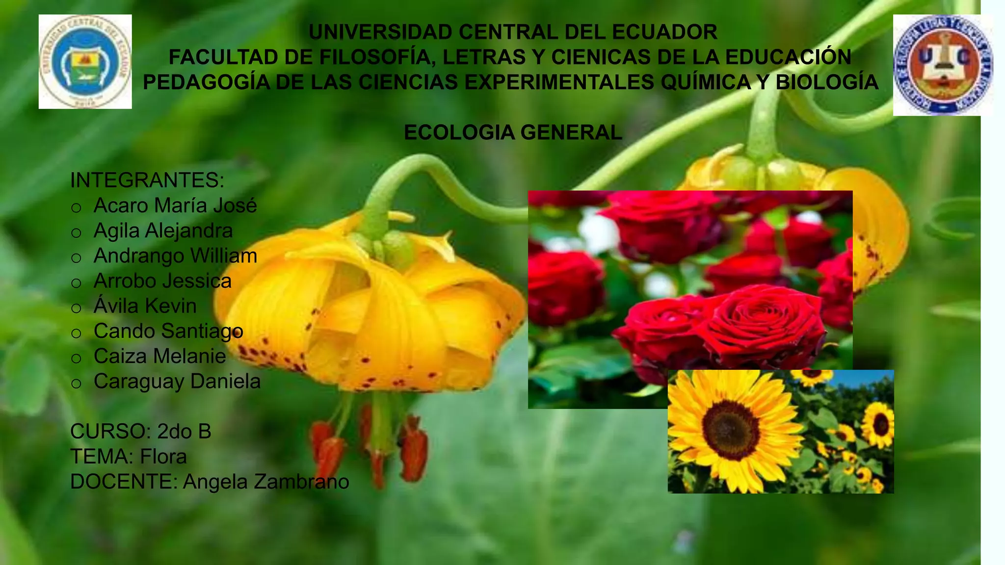El documento aborda la flora, definiéndola como el conjunto de especies vegetales de una región determinada, y explica su relación con la vegetación y los diferentes tipos de flora, como nativa y agrícola. Destaca la diversidad de orquídeas en Ecuador, que alberga más de 4200 especies, además de otros ejemplos de flora significativa en el país. Se menciona la importancia comercial de la exportación de flores, incluyendo rosas y heliconias, y se presentan especies autóctonas valoradas por sus propiedades medicinales.