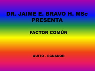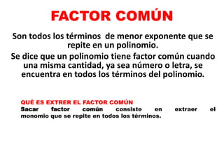 Este documento presenta información sobre el factor común en polinomios. Define el factor común como los términos de menor exponente que se repiten en todos los términos de un polinomio. Explica cómo extraer el factor común de un polinomio y proporciona ejemplos de extraer el factor común de varios polinomios. Finalmente, pide extraer el factor común de 8 ejercicios adicionales de polinomios.