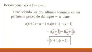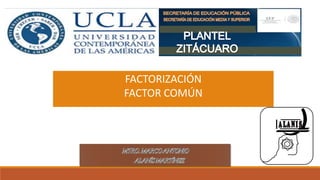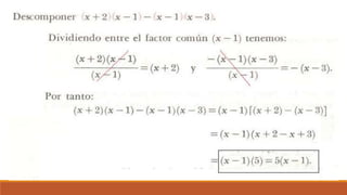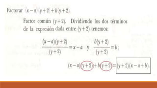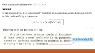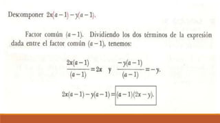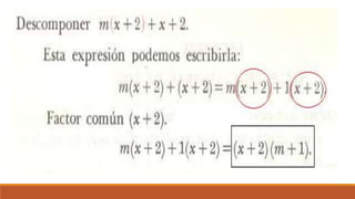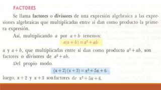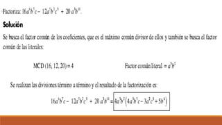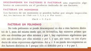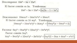 El documento trata sobre la factorización de polinomios y monomios, explicando el concepto de factor común y proporcionando ejercicios para practicar la factorización de expresiones algebraicas.