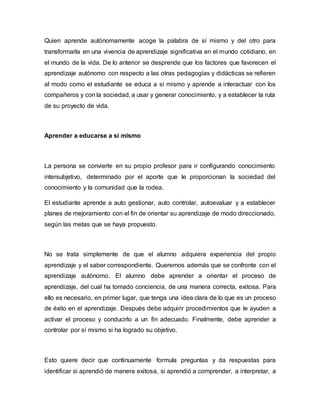 El documento describe factores que favorecen el aprendizaje autónomo. El aprendizaje autónomo implica desarrollar habilidades cognitivas, meta cognitivas, socioculturales y éticas para aprender con los demás. Los estudiantes deben aprender a autorregularse, adquirir hábitos de estudio y mejorar continuamente. El aprendizaje social y trabajar en equipo garantizan el 50% del aprendizaje en la educación superior. El estudiante autónomo orienta su aprendizaje para realizar un proyecto de vida y contribuir