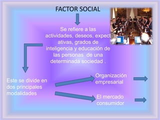 El factor social se refiere a las actividades, deseos y niveles de educación de una sociedad. La organización empresarial se divide en proveedores, accionistas y administración, quienes buscan asegurar los insumos necesarios al menor costo posible, y los clientes o mercado consumidor, cuyos gustos pueden cambiar y causar incertidumbre. El factor social es el más importante porque influye en todos los aspectos económicos y políticos de una sociedad y cómo las empresas se organizan internamente y se relacionan con los clientes para obtener