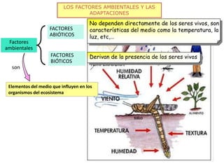 Este documento describe los factores ambientales bióticos y abióticos que afectan a los organismos, y cómo las adaptaciones ayudan a los seres vivos a sobrevivir en diferentes medios. Explica que los factores abióticos como la temperatura, la luz y la humedad influyen en los ecosistemas terrestres y acuáticos, y que las adaptaciones de los animales y plantas como el pelaje aislante, las espinas, las hojas pequeñas y las flores atractivas les permiten sobrevivir en diferentes condiciones ambient