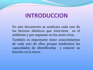 Este documento resume los principales factores abióticos que afectan a los seres vivos, incluyendo el agua, la temperatura, la luz, el suelo, el aire y la atmósfera. Explica que estos factores determinan el espacio físico donde habitan los seres vivos y limitan su crecimiento poblacional. Además, describe brevemente cada factor y su importancia para la vida.