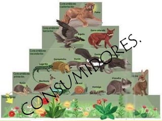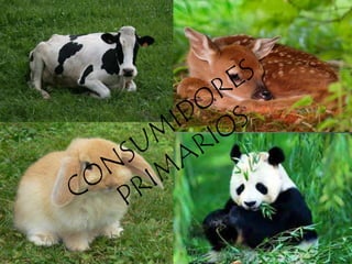 El documento describe los diferentes tipos de factores bióticos en un ecosistema, incluyendo productores, consumidores y descomponedores. Los productores, como las plantas, generan su propio alimento a través de la fotosíntesis. Los consumidores, como los animales herbívoros, obtienen energía al comer plantas u otros animales. Los descomponedores, como hongos y bacterias, descomponen materia orgánica muerta y cierran el ciclo de nutrientes en el ecosistema.