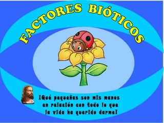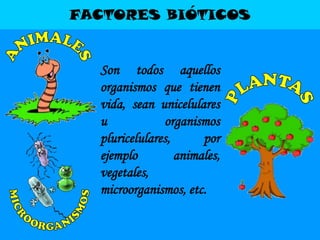 Este documento describe los factores bióticos de un ecosistema. Explica que los factores bióticos son las relaciones entre los seres vivos, incluyendo animales, plantas y microorganismos. Describe las clasificaciones de individuos, poblaciones, comunidades y los roles de productores y consumidores.