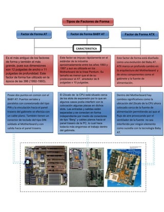 El documento explica los diferentes factores de forma para motherboards. Los factores de forma más comunes son ATX, AT y Baby AT. ATX es el estándar actual y marcó un cambio en el diseño de motherboards y gabinetes. AT era más pequeño que ATX y se usó desde 1993 hasta 1997. Baby AT era aún más pequeño que AT y los puertos estaban separados. El factor de forma determina el tamaño y diseño de la motherboard y su compatibilidad con el gabinete.
