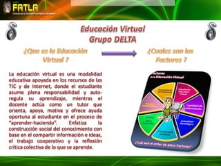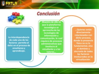 Este documento discute los factores más importantes en la educación a distancia desde la perspectiva de un equipo de tutores. Argumentan que el éxito depende de la habilidad del tutor para integrar efectivamente los factores tecnológicos con los personales a fin de construir un conocimiento significativo con los estudiantes. Cada miembro del equipo contribuye su punto de vista sobre un factor clave. Concluyen que el éxito requiere que el tutor conjugue todos los elementos involucrados de manera de interesar a los estudiantes y permitirles desar