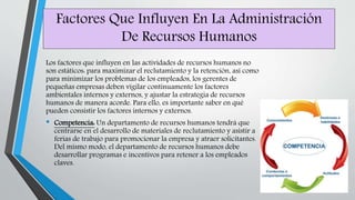 Este documento describe varios factores que influyen en la administración de recursos humanos en las pequeñas empresas. Algunos factores internos incluyen la competencia, la compensación, la legislación y las relaciones con los empleados. Factores externos incluyen la economía y el mercado laboral. Los gerentes de recursos humanos deben monitorear continuamente estos factores y ajustar las estrategias de recursos humanos según sea necesario para el reclutamiento, retención y satisfacción de los empleados.