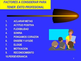 El documento presenta elementos clave para alcanzar el éxito profesional, enfatizando la importancia de aclarar metas, mantener una actitud positiva y ser flexible. Se sugiere colocar el corazón en las acciones, enseñar y ayudar a otros, así como fomentar el trabajo en equipo y reconocer los esfuerzos de los colaboradores. Finalmente, se destaca la perseverancia como factor crítico para aplicar estos principios y lograr un rendimiento efectivo.