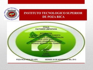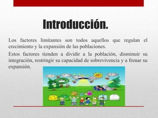 Este documento presenta un resumen de los factores limitantes bióticos y abióticos. Los factores bióticos incluyen individuos, poblaciones y comunidades, mientras que los factores abióticos son características físico-químicas como la temperatura y la humedad. Los factores limitantes regulan el crecimiento de las poblaciones al restringir su capacidad de sobrevivir y expandirse. La Ley de Liebig establece que el crecimiento depende del nutriente más limitante, mientras que la Ley de Tolerancia