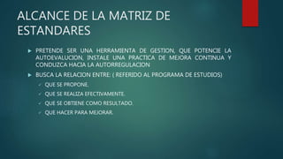 Este documento presenta una matriz de estándares para la acreditación de programas de educación superior universitaria. La matriz incluye 4 dimensiones, 12 factores y 34 estándares relacionados con la gestión estratégica, formación integral, soporte institucional y resultados de los programas. El documento describe cada factor y los estándares asociados para evaluar aspectos como la planificación, gestión docente, procesos de enseñanza-aprendizaje, investigación, infraestructura e inserción laboral de los egresados.
