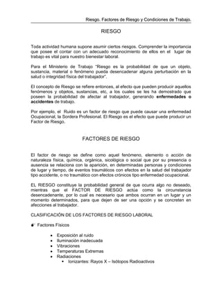 El documento describe los diferentes factores de riesgo que pueden afectar la salud y seguridad de los trabajadores. Explica que los factores de riesgo incluyen aspectos físicos, químicos, biológicos, ergonómicos y otros que pueden causar accidentes o enfermedades. Además, provee una clasificación detallada de los diferentes tipos de factores de riesgo y ejemplos de riesgos específicos encontrados en diferentes industrias.
