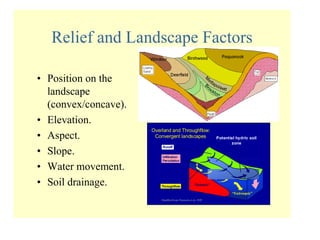 I. Los factores que influyen en la formación de los suelos incluyen la roca madre, el clima, la topografía, el tiempo y los organismos. II. El clima regula la cantidad de agua y la temperatura en el suelo, afectando procesos como la translocación. La cantidad de arcilla y materia orgánica depende del clima. III. La topografía, como la pendiente y la posición en la ladera, afecta la distribución de los suelos debido a procesos como la erosión. Los horizontes de los suelos