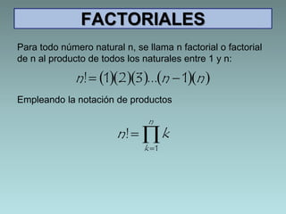 1. El documento describe las propiedades básicas del factorial y las sumatorias, incluyendo sus definiciones y fórmulas clave. 2. El factorial de un número natural n es el producto de todos los números naturales entre 1 y n. 3. Una sumatoria representa la suma de un conjunto finito de números y se denota como la suma desde un punto inicial hasta uno final.