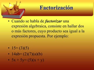 El documento explica diferentes métodos para factorizar expresiones algebraicas, incluyendo factor común, agrupación de términos, diferencia de cuadrados, trinomio cuadrado perfecto, trinomios de la forma x2 + bx + c y ax2 + bx + c, y suma y diferencia de cubos. También proporciona una estrategia general para identificar qué método aplicar dependiendo del tipo de expresión.
