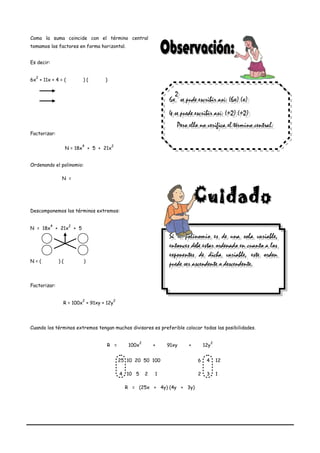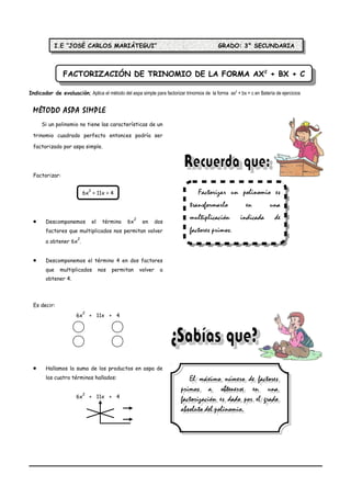 1) El documento explica cómo factorizar trinomios de la forma ax2 + bx + c usando el método del aspa simple. 2) Este método involucra descomponer los términos extremos en factores que, al multiplicarse, vuelvan a dar el término y luego hallar la suma de los productos en aspa. 3) El documento también provee ejemplos de aplicación del método y ejercicios de práctica para factorizar diferentes trinomios.