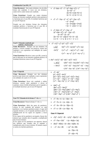 El documento resume 9 casos de factorización de expresiones algebraicas. En cada caso, describe cómo reconocer la estructura y el método para factorizarla, ilustrando con ejemplos. Los casos incluyen factor común, trinomio cuadrado perfecto, diferencia de cuadrados, suma y diferencia de cubos, y más. El documento proporciona una guía completa para factorizar diferentes tipos de expresiones.