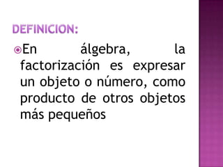 El documento explica diferentes métodos para factorizar polinomios. Describe cómo factorizar polinomios cuando hay un factor común, cuando hay términos cuadrados perfectos, cúbicos perfectos o trinomios cuadráticos. Incluye ejemplos para ilustrar cada método de factorización.