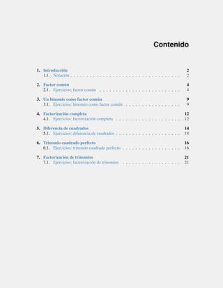 Este documento presenta diferentes técnicas para factorizar expresiones algebraicas, incluyendo encontrar un factor común, factorizar un binomio como factor común, factorización completa, diferencia de cuadrados, trinomio cuadrado perfecto y factorización de trinomios. Proporciona ejemplos y ejercicios resueltos de cada técnica.
