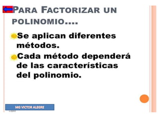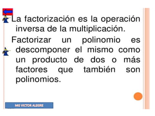 Este documento explica diferentes métodos para factorizar expresiones algebraicas, incluyendo la diferencia de cuadrados, agrupación de términos y aspa simple. Proporciona fórmulas, ejemplos numéricos y paso a paso para cada método. Explica cómo factorizar expresiones que contienen números enteros, racionales e irracionales usando las diferentes técnicas.