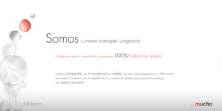 Somos es una nueva agencia que ofrece ideas creativas y soluciones innovadoras para sus proyectos a través de su propia producción. Cuentan con experiencia en diseño, publicidad, producción de eventos, marketing y comunicaciones. Sus proyectos incluyen stands publicitarios, showrooms, vitrinas, diseño gráfico y más, siempre definiéndose por sus ideas originales.