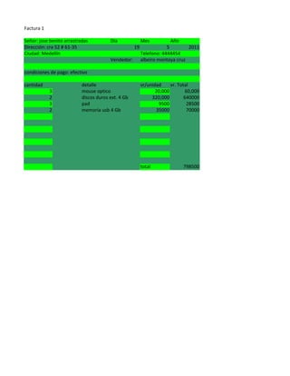La factura enumera los artículos vendidos a José Benito Arrastradas el 19 de mayo de 2011, incluyendo 3 mouse ópticos, 2 discos duros externos de 4 Gb, 3 pads y 2 memorias USB de 4 Gb, sumando un total de $798,500 pesos colombianos a pagar en efectivo.