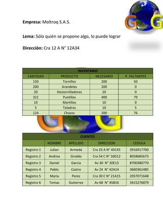 El documento presenta información sobre el Colegio Nicolás Esguerra, incluyendo el inventario de productos, lista de clientes con sus nombres, apellidos, direcciones y cédulas, lista de empleados con la misma información y lista de proveedores con sus nombres, direcciones y NIT.