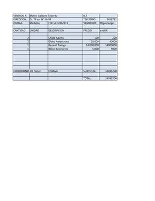 El documento es una factura de venta que detalla los productos vendidos a Mateo Galeano Taborda en Medellín el 6 de junio de 2011. Se le vendieron 2 chicles Adams a $100 cada uno, 2 globos aerostáticos a $20,000 cada uno, un Renault Twingo a $14 millones y un balón de baloncesto a $5,000, sumando un total de $14,045,200 que se pagaría al contado.