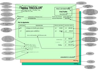 El documento es una factura emitida por Textiles El Telar S.A.C. a Comercial La Virreyna S.A.C. por la venta de 20 chompas de dralón para damas a S/30 cada una y 15 pijamas para caballeros a S/20 cada uno, por un subtotal de S/900. El IGV aplicado fue de 18% sobre el subtotal, ascendiendo a S/162, por un total de S/1062. La factura fue impresa por Imprenta ABC S.A.C.