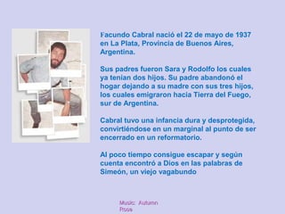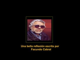 Facundo Cabral nació en 1937 en Argentina y tuvo una dura infancia. Se convirtió en un vagabundo y encontró a Dios en las palabras de otro vagabundo. A lo largo de su vida, Cabral compartió reflexiones optimistas sobre apreciar la belleza del mundo y la generosidad de la vida a pesar de los desafíos como su pérdida de visión. Considera que el cuerpo es temporal pero el espíritu y las ideas perduran, y se enfoca en sacarle partido a lo que Dios le ha dado.