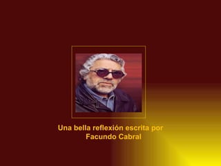 "LA VIDA ESGENEROSA “ Así lo cree Facundo Cabral, quien asegura no entender a aquellos que no saben apreciarla. Pero los años no le han sido indiferentes Es que es la vejez –la que él define como "la estación serena de la vida "– su último gran descubriento. "Lo único que se desbarata es el cuerpo. Pero yo no soy el cuerpo. El cuerpo es el vehículo que me lleva de la cuna a la tumba. Yo soy mi espíritu, mi alma y las ideas que arman mis neuronas Dios me dio esto y aprendí a querer lo que me dio. Y le estoy sacando partido".
